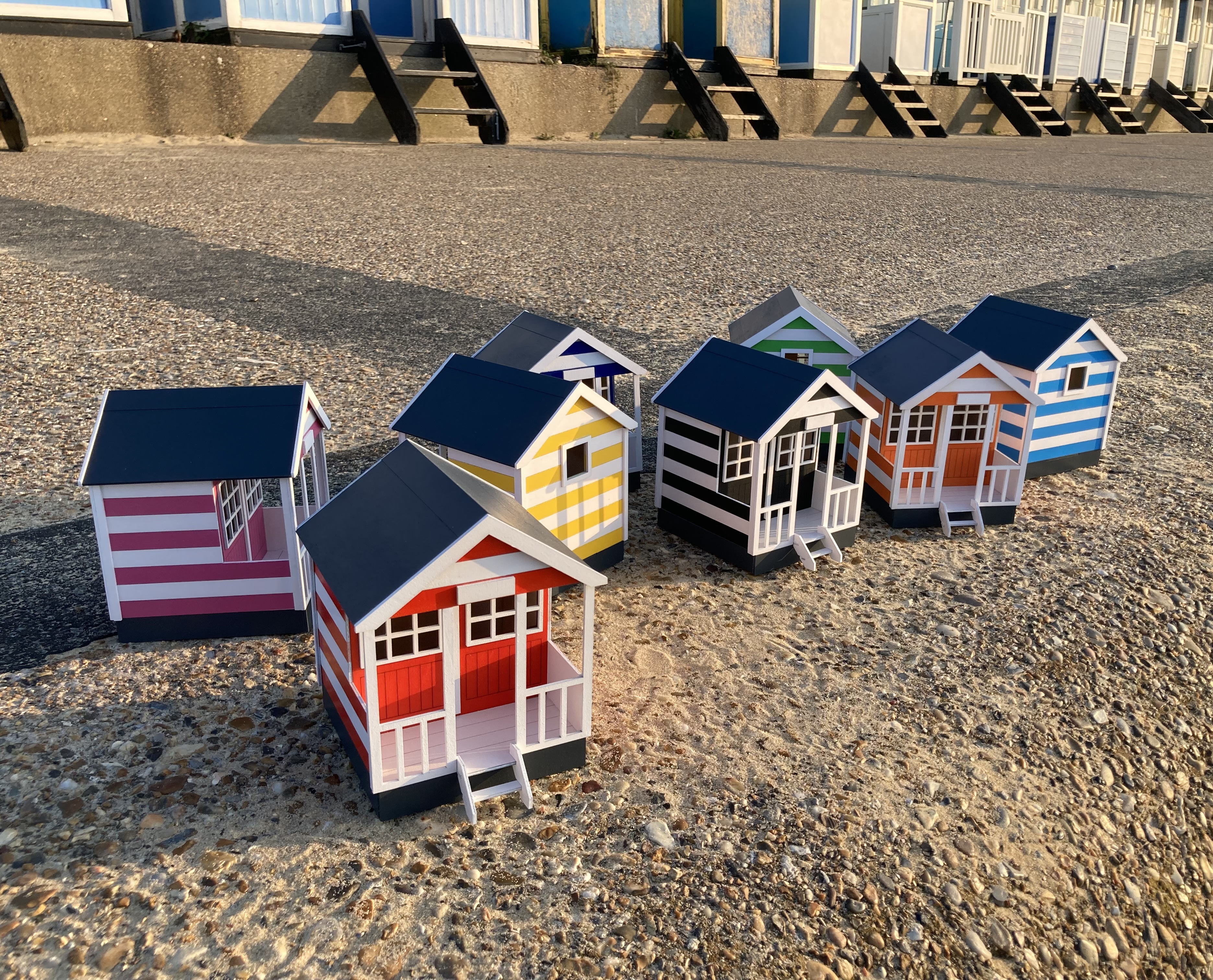 My miniature Suffolk beach hut in raspberry & white stripes. From a range of 16 different colour ways. Inspired by my holidays in sunny Southwold walking from Gun Hill towards the pier. Laser cut in 1.6mm plywood then assembled and hand painted. FREE personalised name plate on front panel makes this a uniquely memorable gift or memento. Combine with other stripy huts to make a colourful row. Seagulls not included!